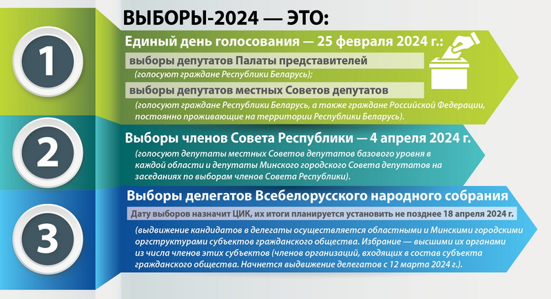 Единый день голосования в Беларуси пройдет 25 февраля 2024 года. Избираться будут депутаты Палаты представителей Национального собрания восьмого созыва и местных Советов депутатов двадцать девятого созыва. 4 апреля 2024 года пройдут выборы членов Совета Республики, затем – делегатов Всебелорусского народного собрания от субъектов гражданского общества и местных Советов депутатов.