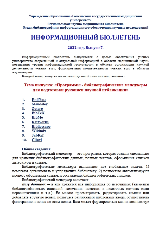 Сотрудниками отдела библиографии и информационного обеспечения научных исследований подготовлен Информационный бюллетень «Программы — библиографические менеджеры для подготовки рукописи научной публикации».