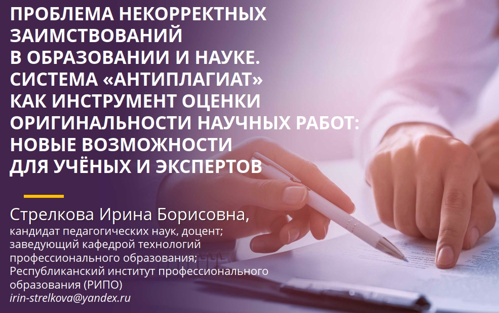 По результатам проведенного 14 мая 2021 г. семинара «Проблема некорректных заимствований в образовании и науке. Система «Антиплагиат» как инструмент оценки оригинальности научных работ: Новые возможности для учёных и экспертов» размещаем материалы, предоставленные представителем компании «Антиплагиат» Стрелковой Ирины Борисовны.