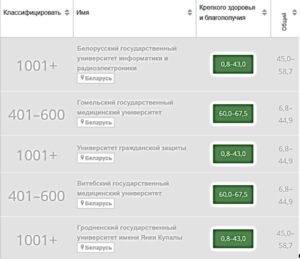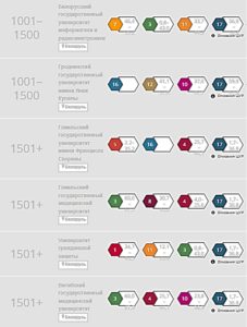 В данный рейтинг вошли 9 белорусских вузов. Среди них БГУ, который получил 1501+ место в мировом рейтинге, а также вместе с Гомельским государственным медицинским университетом статус «репортер» был присвоен 8 белорусским вузам: БГМУ, БГУИР, ВГТУ, ГГУ имени Ф. Скорины, ГрГМУ, ГрГУ имени Янки Купалы, УГЗ МЧС.