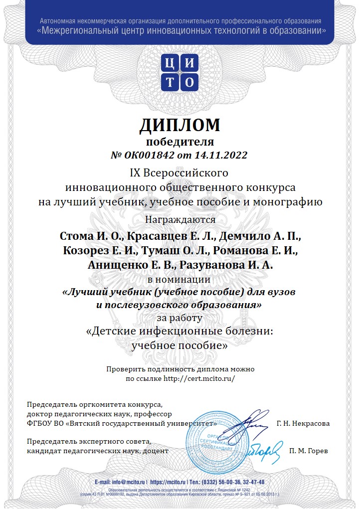 Детские инфекционные болезни: учебное пособие (авторы – Стома Игорь Олегович, Красавцев Евгений Львович, Демчило Антонина Павловна, Козорез Елена Ивановна, Тумаш Оксана Леонидовна, Романова Елена Ивановна, Анищенко Елена Васильевна, Разуванова Ирина Александровна);