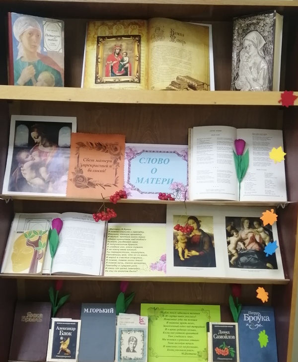 На выставке представлена художественная литература о материнской любви, о том, что надо беречь близких пока они с тобой, не жалеть для них тепла своей души (А. Блок, А. Фет, М. Горький, Д. Самойлов, С. Есенин, Я. Брыль, П. Бровка и др.); а также репродукции известных художников, которые с помощью кисти смогли передать и описать все то, что содержит нежное, чудесное, доброе имя – мама. (М. Савицкий, А. Бронзино, Рембрандт, П. Сезан и др).