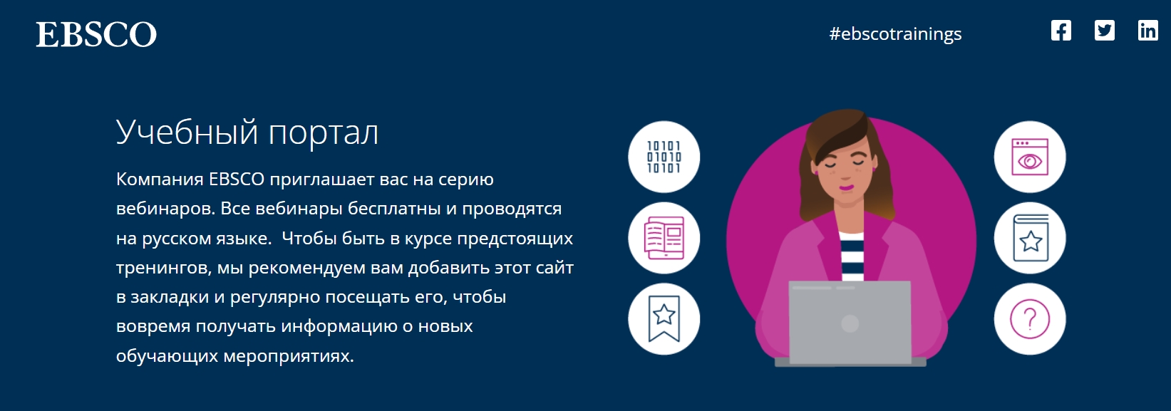Ознакомиться с тематикой всех вебинаров, запланированных на январь, и зарегистрироваться на заинтересовавшие вас можно на учебном портале EBSCO