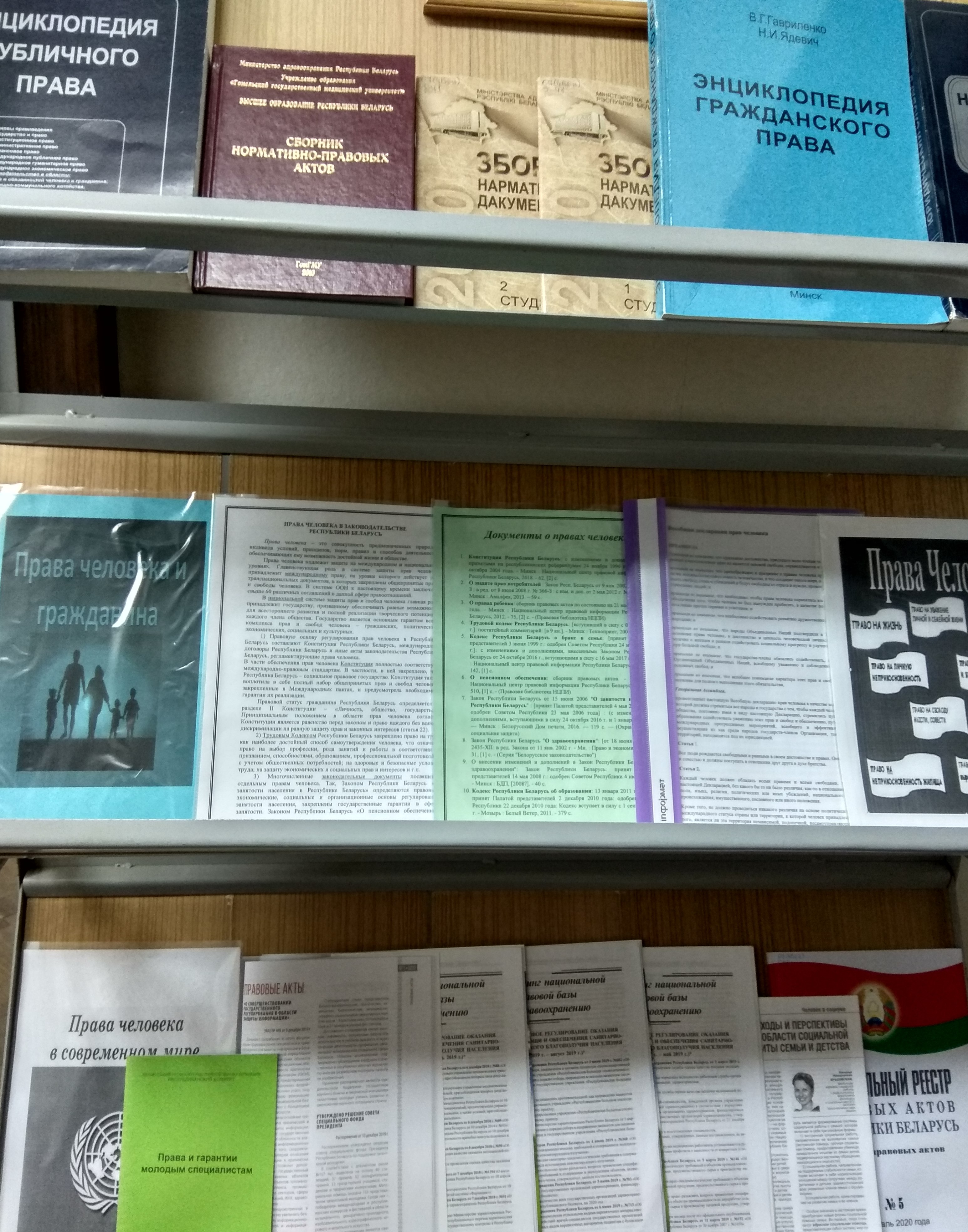На выставке представлена информация о законодательных актах Беларуси, брошюры о правах и свободах граждан Республики Беларусь, литература о защите прав человека.